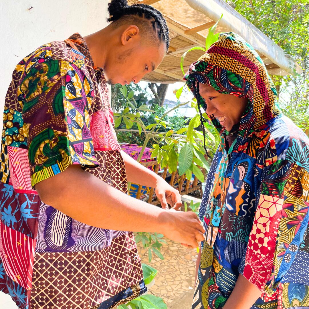 個性あふれるアフリカ布を一枚一枚丁寧に縫い合わせて仕上げた、まさに“着るアート”。