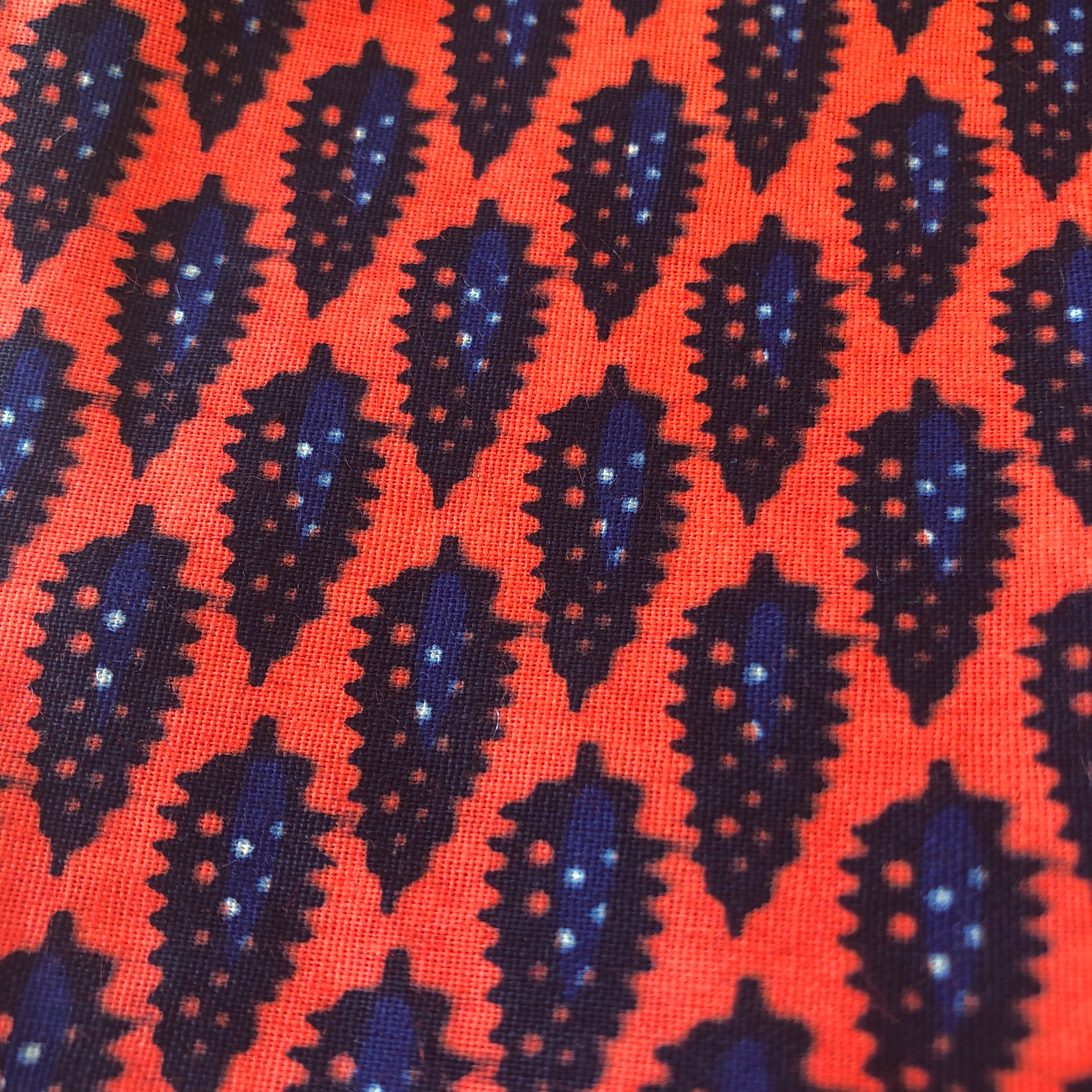 アフリカンプリント布は、時に染めむらや多少の柄ずれがあるものがありますが、布のプリント過程中に生じたものです。