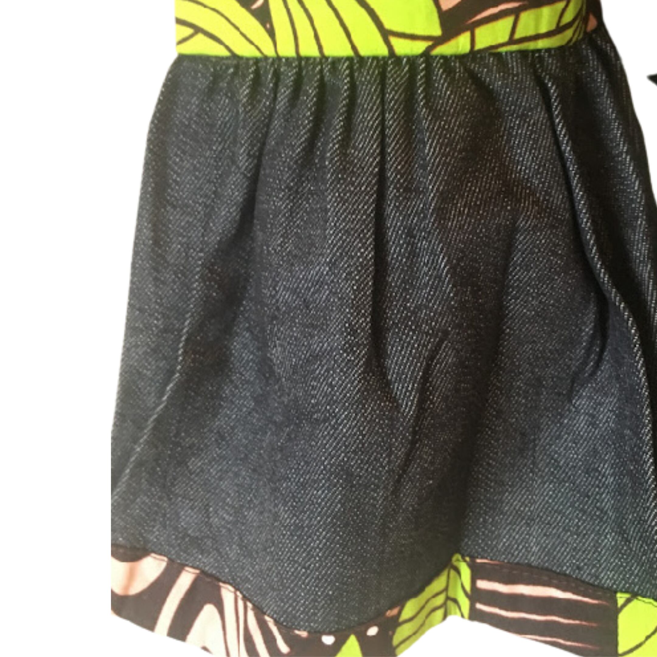 デニムとアフリカンプリントをミックスした上品かつ可愛いコンビネゾン。