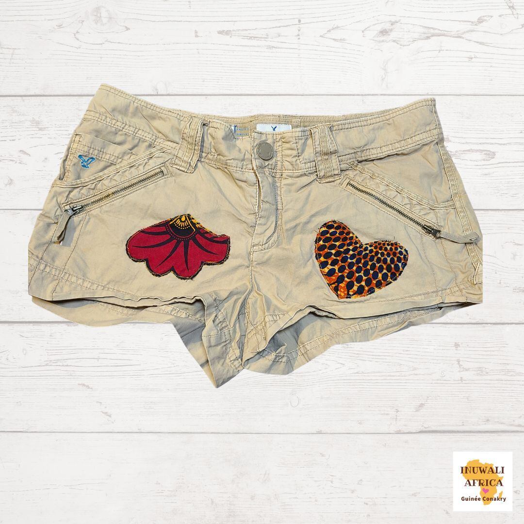 アフリカ布 × カーキショートパンツ "2" レディースパンツ パーニュ カンガ キテンゲ ギニア フェアトレード INUWALIAFRICA | 〈INUWALI AFRICA イヌワリアフリカ〉ギニア発のアフリカ布ファッション&ジャンベのオンラインストア