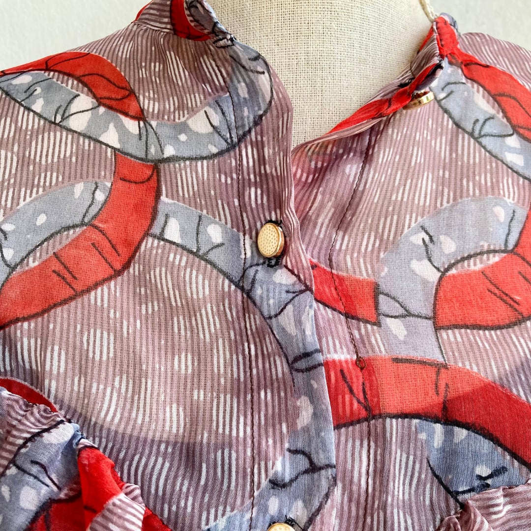 華やかなパーティーやエレガントな日常着にぴったりな、アフリカ布柄のシフォン布地を使用したトップス。ふわっとした袖とフリルがフェミニンな魅力と、薄いシースルーの透け感が、洗練されたスタイルを演出します。ボタンの付いた前あきです。